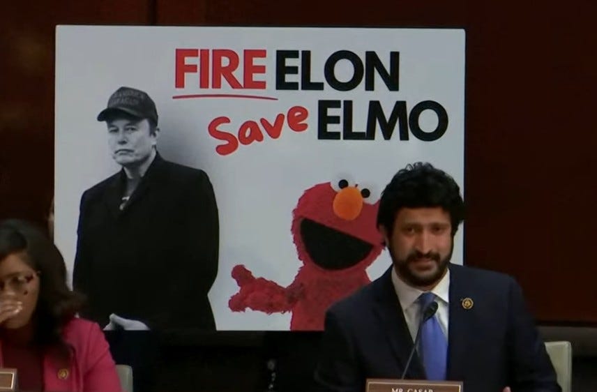 The total funding for public broadcasting is just one sixth, the amount that Elon Musk's companies make off of the government every single year. But you will not see Elon Musk being grilled by this committee. I've seen a lot, but pointing the finger at Elmo to cover for Elon Musk might be a new low. For Miss Marjorie Taylor Greene's committee.