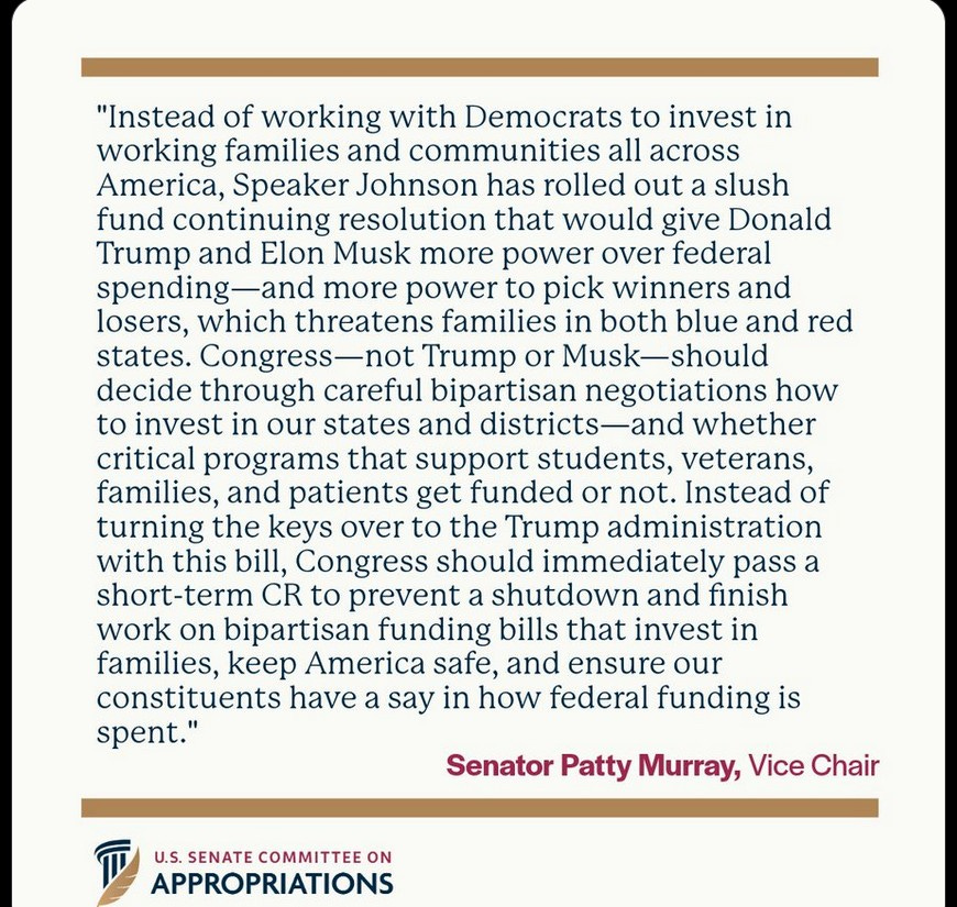 The top Democratic appropriators in the House and Senate have both slammed Trump and Mike Johnson's government funding resolution because it hands power to Elon Musk.